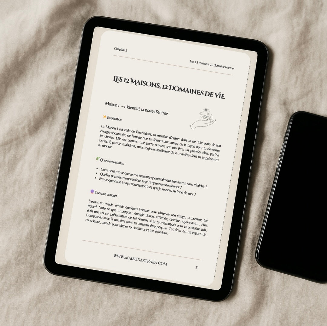 Chaque maison devient une porte ouverte sur ton univers intĂ©rieur, avec des explications claires, des questions-guides et des exercices concrets pour transformer lâastrologie en un outil vivant de connaissance de soi.